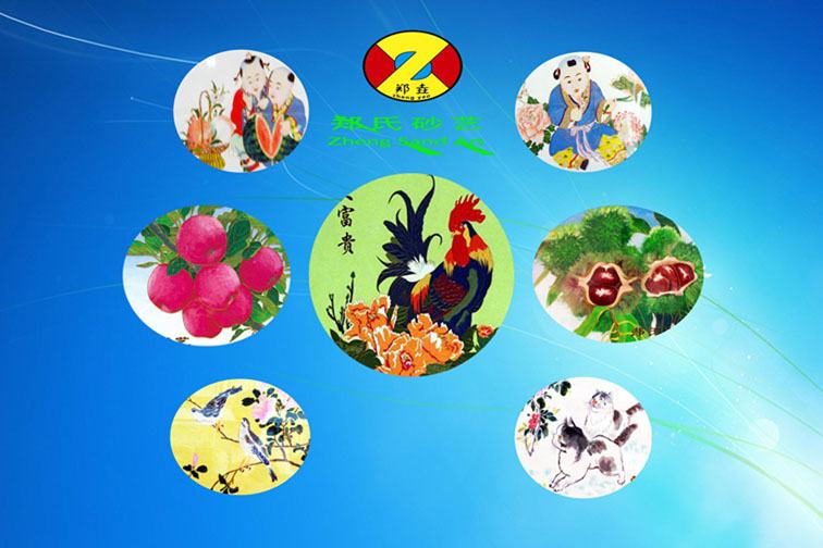 鄭氏砂藝畫,始創(chuàng)于晚清秀才鄭克祥,距今已有180多年的歷史。聽老一輩人口口相傳和史料記載,作為天祖的晚清秀才鄭克祥,酷愛讀書,習(xí)字繪畫,也愛游山玩水,游學(xué)中發(fā)現(xiàn)了一種新奇的作畫方式,他們的材質(zhì)不是筆墨紙硯,而是從自然界中提煉出的精細砂礫,先用樹木的纖細枝條勾勒出畫面的主要輪廓,再用天然彩砂作為畫面的色彩,用榆樹皮熬膠粘接,做出的畫面色彩靚麗,線條舒暢而且能久藏卻不褪色,于是便認真地學(xué)習(xí)起來,學(xué)習(xí)研究中發(fā)現(xiàn)這種砂畫有畫面不牢固容易破損的缺點,隨即對砂畫的不足之處進行了大膽的改革創(chuàng)新,使砂畫作品大大提升了檔次,許多作品被商賈人士收藏,就是當(dāng)?shù)乜h官、州官也常常購買進貢朝廷,博得皇帝喜愛、收藏。從此我們祖上的鄭氏砂畫立腕成名且名揚當(dāng)時。