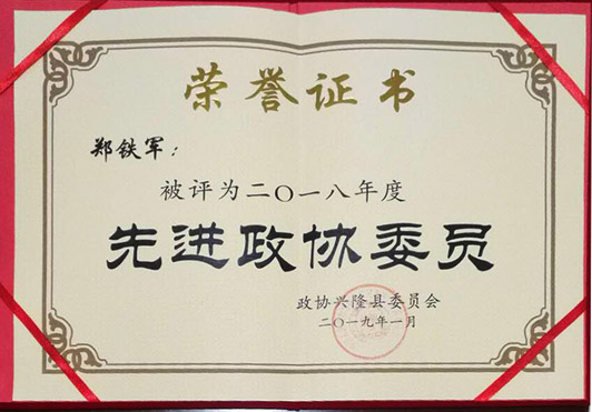2019年1月政協(xié)興隆縣委員會為彰顯鄭鐵軍同志在2018年政協(xié)工作中的突出表現(xiàn),特向鄭鐵軍同志頒發(fā)《先進(jìn)政協(xié)委員》榮譽(yù)證書!