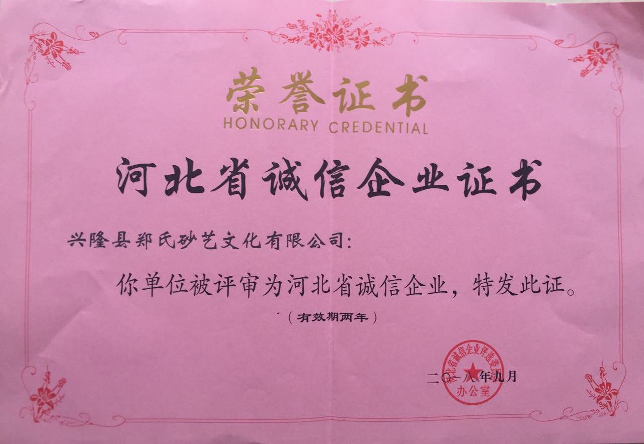 2018年9月27日,興隆縣鄭氏砂藝文化有限公司榮獲了由河北省誠信企業(yè)評選委員會辦公室頒發(fā)的《河北省誠信企業(yè)》稱號,這是繼2014年、2016年后連續(xù)第三次獲此殊榮,為構(gòu)建誠信河北、和諧河北、促進(jìn)全省經(jīng)濟(jì)平穩(wěn)較快發(fā)展發(fā)揮了積極的帶頭作用,為推動我省誠信企業(yè)建設(shè)做出了一定的貢獻(xiàn)。鄭氏砂藝將珍惜榮譽、再接再厲,在創(chuàng)建誠信企業(yè)活動中不斷做出新成績。