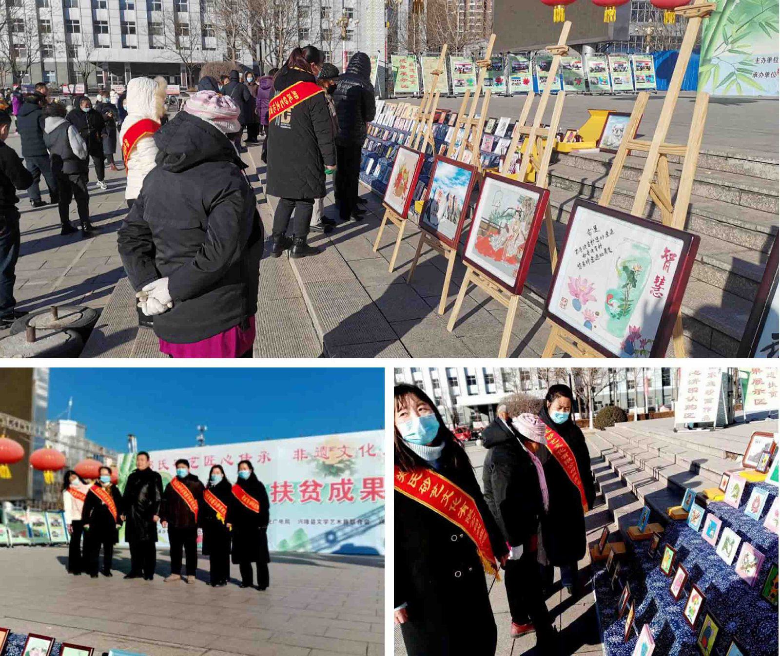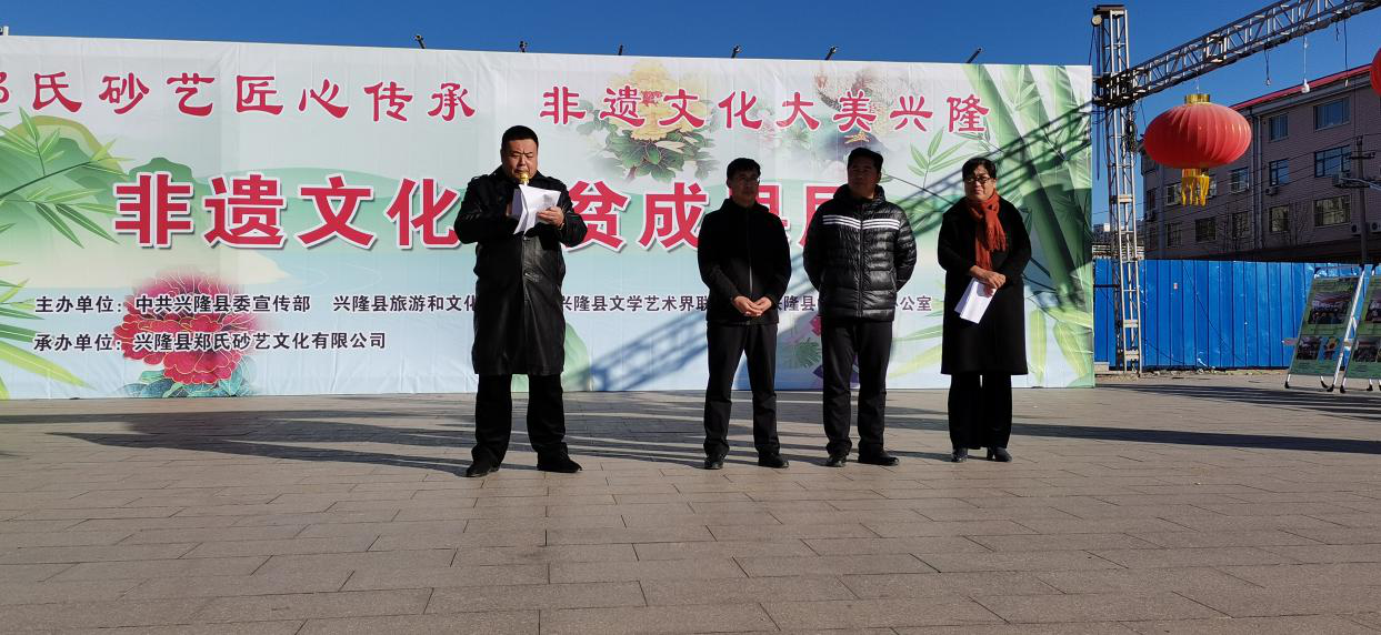 2020年11月27日。由中共興隆縣委宣傳部、興隆縣旅游和文化廣電局、興隆縣文學(xué)藝術(shù)界聯(lián)合會(huì)、興隆縣扶貧開發(fā)辦公室主辦的、由興隆縣鄭氏砂藝文化有限公司承辦的《非遺文化扶貧成果展》在興隆縣中心廣場拉開帷幕。展會(huì)由興隆縣文學(xué)藝術(shù)界聯(lián)合會(huì)主席王久俠主持,鄭氏砂藝文化 有限公司董事長鄭鐵軍致開幕詞。文聯(lián)主席王久俠作重要講話。她說:“鄭氏砂藝是祖?zhèn)骷妓嚕瑤啄陙磬嵤仙八嚪e極開展非遺文化扶貧,培訓(xùn)全縣400余名貧困婦女,制作出了具有飽含鄉(xiāng)土氣息,美輪美奐的砂藝作品。讓他們用巧手脫貧致富,為脫貧攻堅(jiān)作出顯著貢獻(xiàn)?!彪S后縣委宣傳部常務(wù)副部長隋云鵬、縣旅游和文化廣電局黨委書記閆海濤、文聯(lián)主席王久俠由砂藝公司董事長鄭鐵軍、公司工會(huì)主席趙文紅等引導(dǎo)下,觀摩了“扶貧培訓(xùn)成果展區(qū)”、“消費(fèi)扶貧展區(qū)”、“貧困戶作品展區(qū)”及“愛心認(rèn)購展區(qū)”。四區(qū)展介及作品。對鄭氏砂藝非遺文化扶貧成果給予充分肯定,并興致勃勃地欣賞了鄭氏砂藝美輪美奐的貧困戶作品。