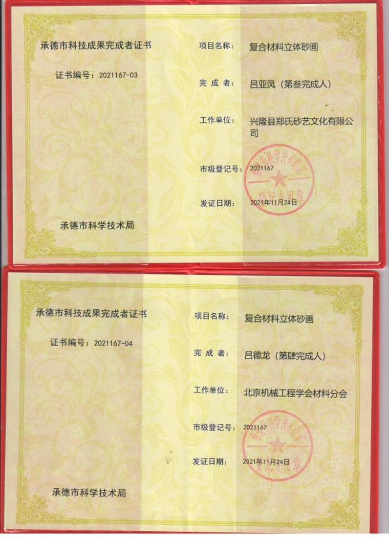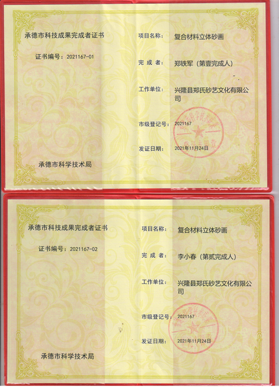 2021年11月24日,鄭氏砂藝圓滿完成了復(fù)合材料立體砂畫項(xiàng)目,獲得由承德市科技局頒發(fā)的《承德市科技成果證書》(市級(jí)登記號(hào):2021167),該項(xiàng)目課題來源于承德市科學(xué)技術(shù)研究與發(fā)展計(jì)劃,由我公司和北京機(jī)械工程學(xué)會(huì)材料分會(huì)共同完成。項(xiàng)目以天然彩砂和金屬絲為主要材料,畫面中加入其它復(fù)合材料(如山楂核、樹葉等),制成立體砂畫,砂畫畫面采用透明樹脂壓膜技術(shù),保持彩砂畫面與膜不脫落,不褪色。通過該項(xiàng)目的研究,企業(yè)創(chuàng)新產(chǎn)品5個(gè)系列200多種作品,其中包括:砂畫木質(zhì)筆筒系列、水晶砂畫系列、砂畫手機(jī)殼系列、磁盤砂畫系列、活性炭砂畫系列,極大的提升企業(yè)產(chǎn)品質(zhì)量。