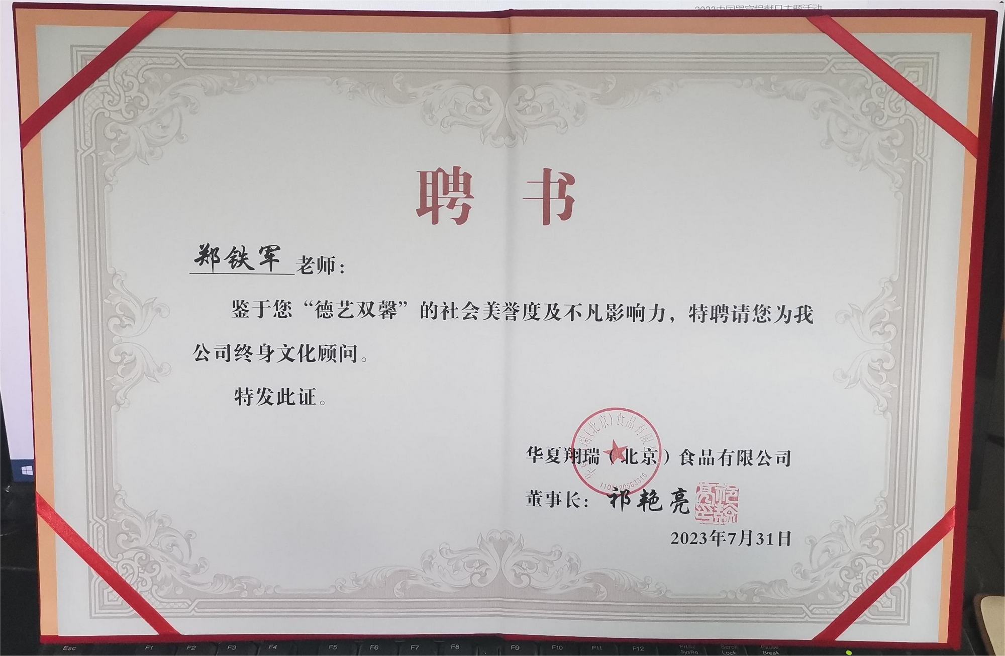 2023年7月31日,鄭鐵軍老師砂畫作品《牡丹》被華夏翔瑞(北京)食品有限公司永久收藏,同時(shí)鄭鐵軍老師被該公司聘為終身文化顧問。