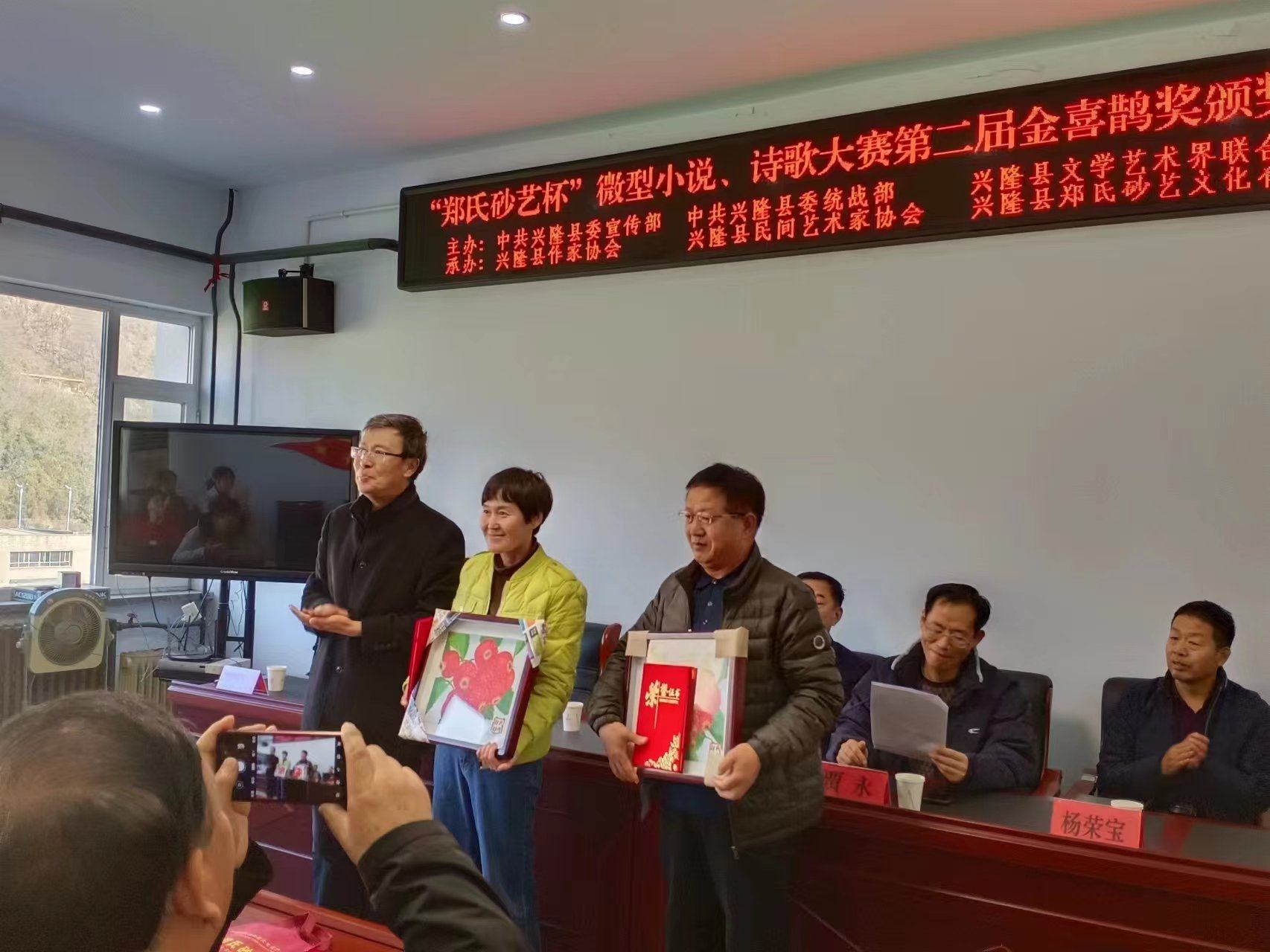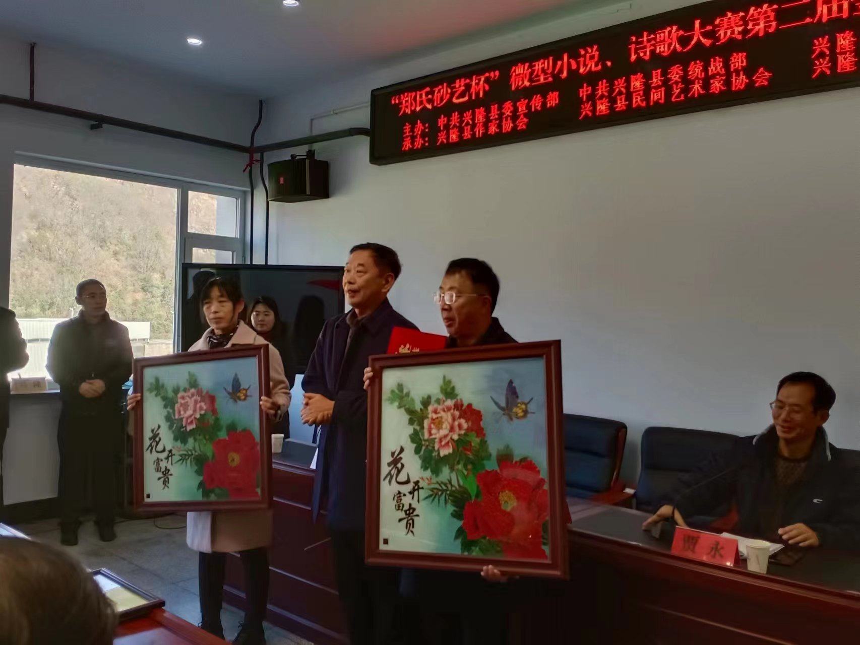 作協(xié)王金石主席,鄭氏砂藝辦公室主任、縣民協(xié)副主席張國新為三等獎獲得者代表頒發(fā)榮譽證書和價值105元的鄭氏砂藝(畫)《生肖》。       多年來,鄭氏砂藝始終致力于文化興隆、大美興隆的建設,在上級領導和社會各界友好人士的關懷下,多次開展以鄭氏砂藝非遺文化為主題的征文、展覽、研學和培訓活動,并取得了豐碩的成果,產(chǎn)生了良好的經(jīng)濟和社會效益。今后鄭氏砂藝將再接再厲,從非遺文化助力鄉(xiāng)村振興和非遺文化創(chuàng)新展示等多個方面開展文化活動,為繁榮我縣文化事業(yè)發(fā)展作出應有的貢獻。