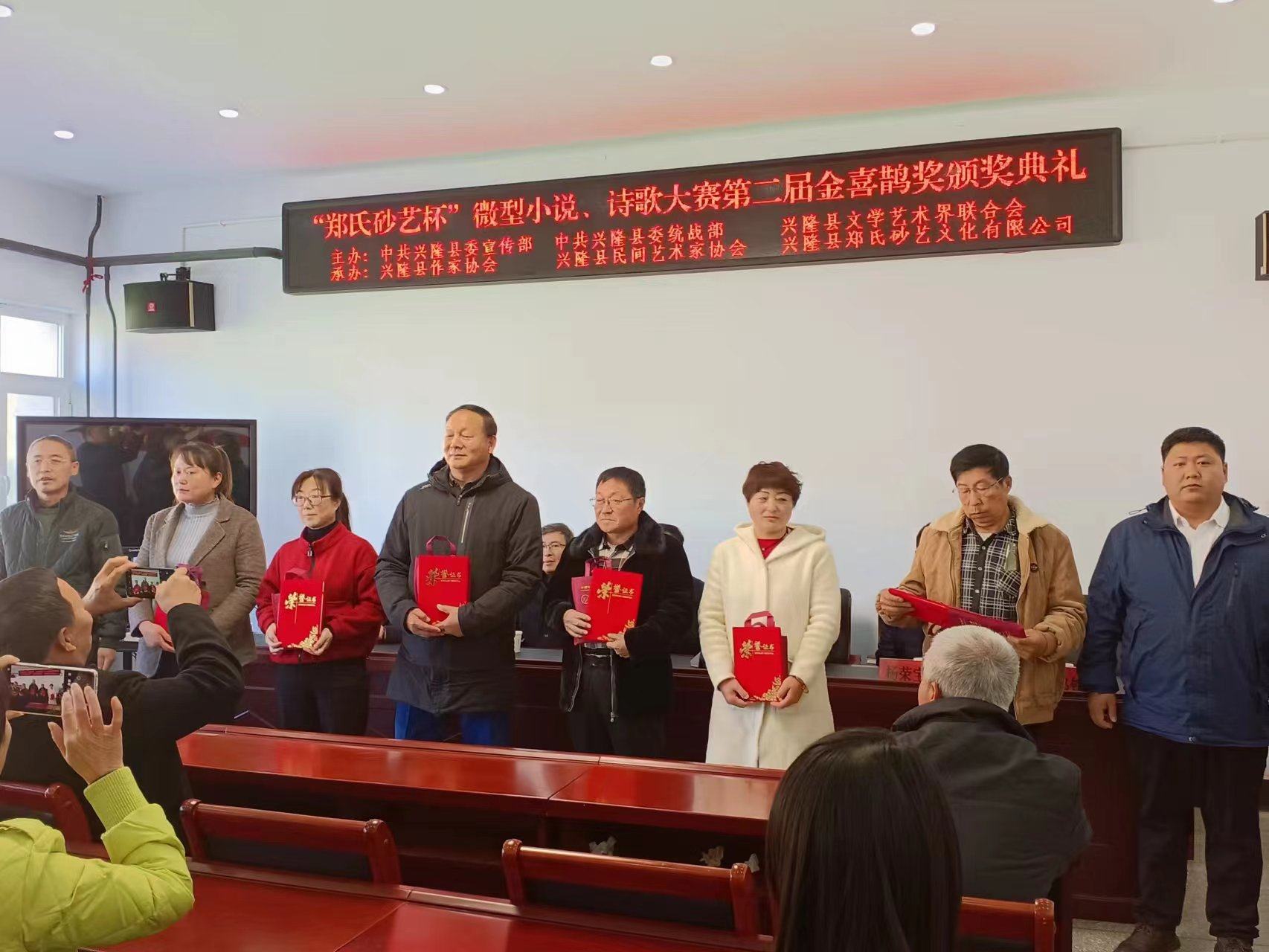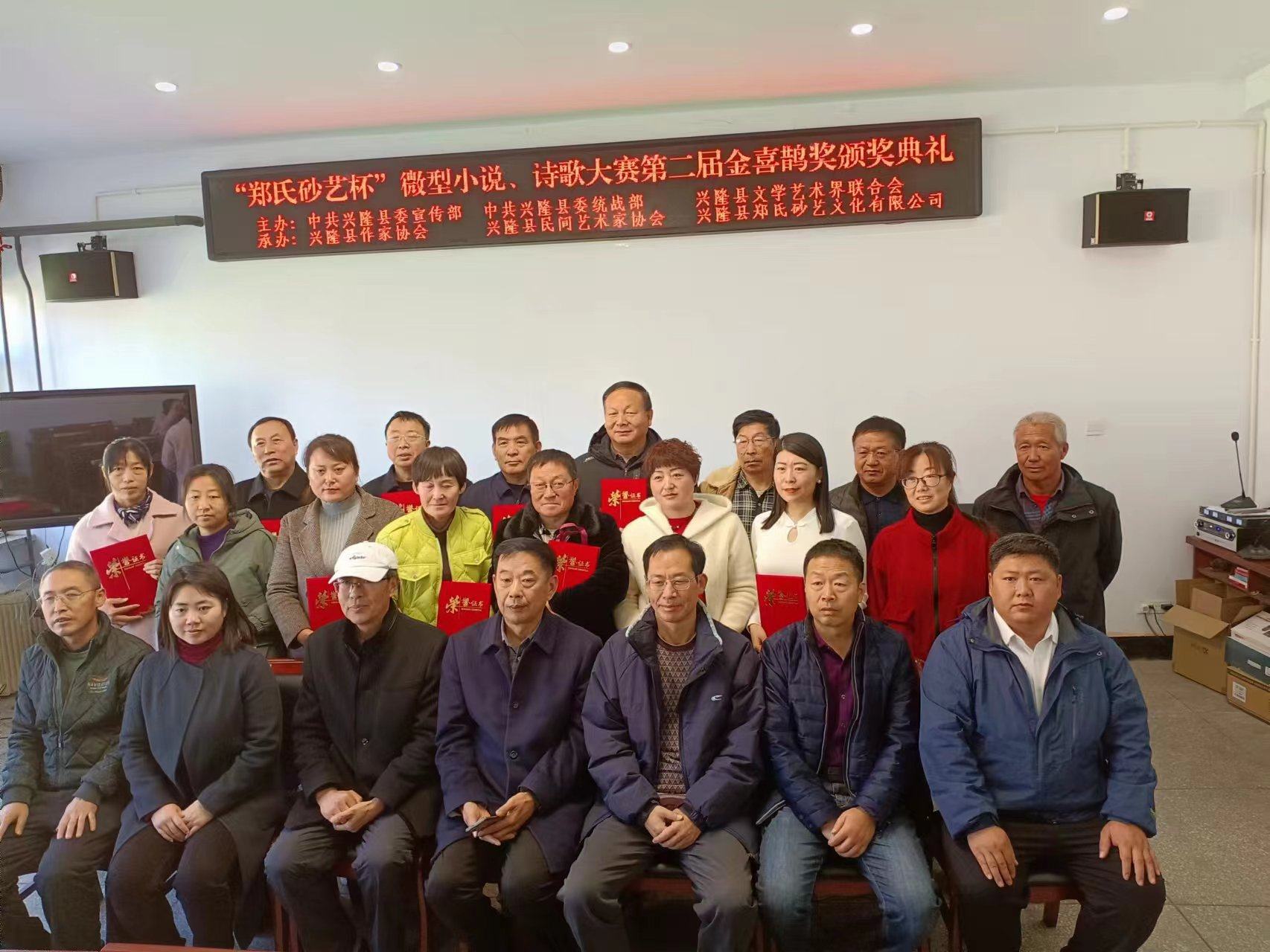 2023年11月9日上午,在興隆縣鄭氏砂藝文化有限公司舉辦了由中共興隆縣委宣傳部、中共興隆縣委統(tǒng)戰(zhàn)部、興隆縣文學藝術界聯(lián)合會主辦,興隆縣作協(xié)、興隆縣民間藝術家協(xié)會和興隆縣鄭氏砂藝文化有限公司承辦的“鄭氏砂藝杯”微型小說、詩歌大賽第二屆金喜鵲獎頒獎典禮,出席此次頒獎典禮的主要領導有承德市作家協(xié)會主席王琦,承德市文聯(lián)二級調研員閆春生,興隆縣委宣傳部副部長、文明辦主任溫偉,興隆縣委統(tǒng)戰(zhàn)部常務副部長楊榮寶,興隆縣作協(xié)主席王金石,興隆縣鄭氏砂藝文化有限公司董事長、縣民協(xié)主席鄭鐵軍及“鄭氏砂藝杯”微型小說、詩歌大賽獲獎人員,典禮由興隆縣文學藝術界聯(lián)合會主席賈永主持。