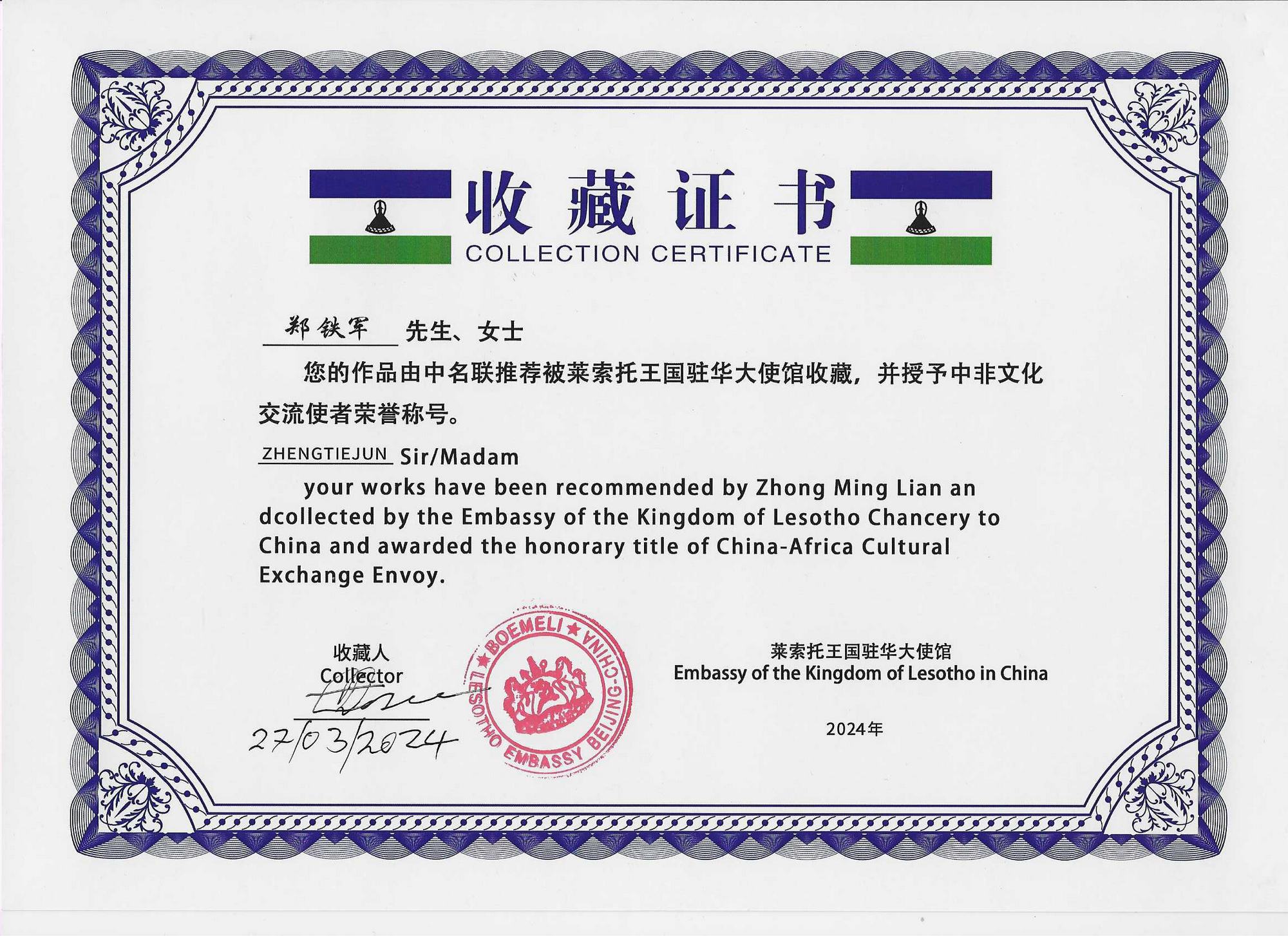 萊索托王國駐華大使邀請中名聯(lián)國際趙萍女士推薦的中名聯(lián)簽約國禮藝術(shù)家鄭鐵軍,于2024年3月26日至27日上午前往萊索托王國駐華大使館進行中萊文化交流。萊索托駐華外交官杜麥羅.莫塞邁公使銜參贊對趙萍女士和鄭鐵軍先生的到來表示熱烈歡迎。在萊索托王國駐華使館會客廳中,鄭鐵軍向杜麥羅.莫塞邁介紹了鄭氏砂藝(畫)藝術(shù)特點和文化內(nèi)涵,萊索托王國外交官對鄭鐵軍的作品給予高度評價,對傳統(tǒng)文化藝術(shù)鄭氏砂藝(畫)所蘊含的深厚中華文化底蘊極其贊賞,現(xiàn)場將鄭鐵軍的作品《國色天香》作為國禮永久收藏。杜麥羅.莫塞邁公使銜參贊表示非常榮幸,愿意將更多的鄭氏砂藝(畫)作品贈送全球友華政要,成為中國文化國際傳播橋梁,隨后,親筆簽名收藏證書,并授予鄭鐵軍中非文化交流使者榮譽稱號。