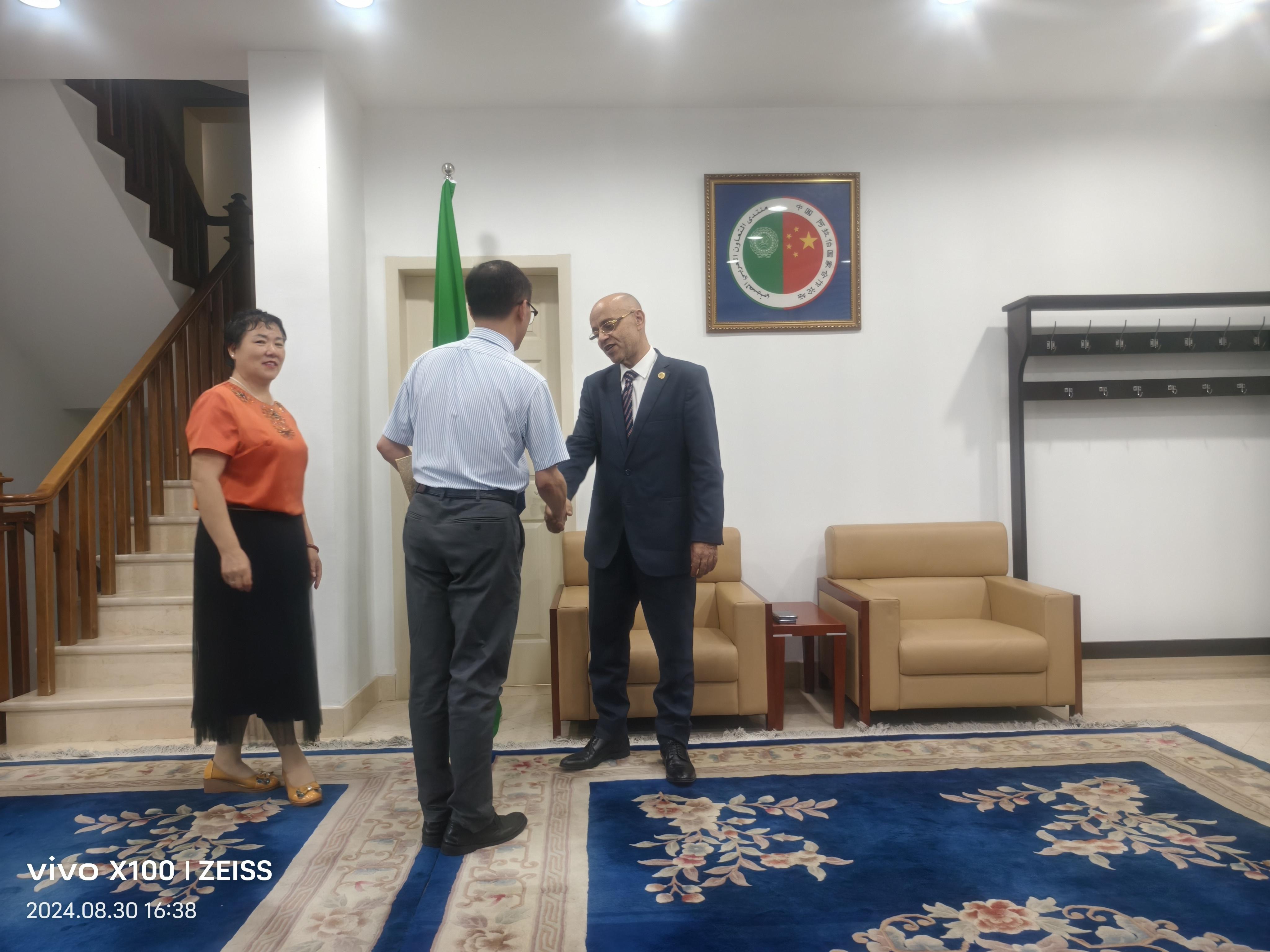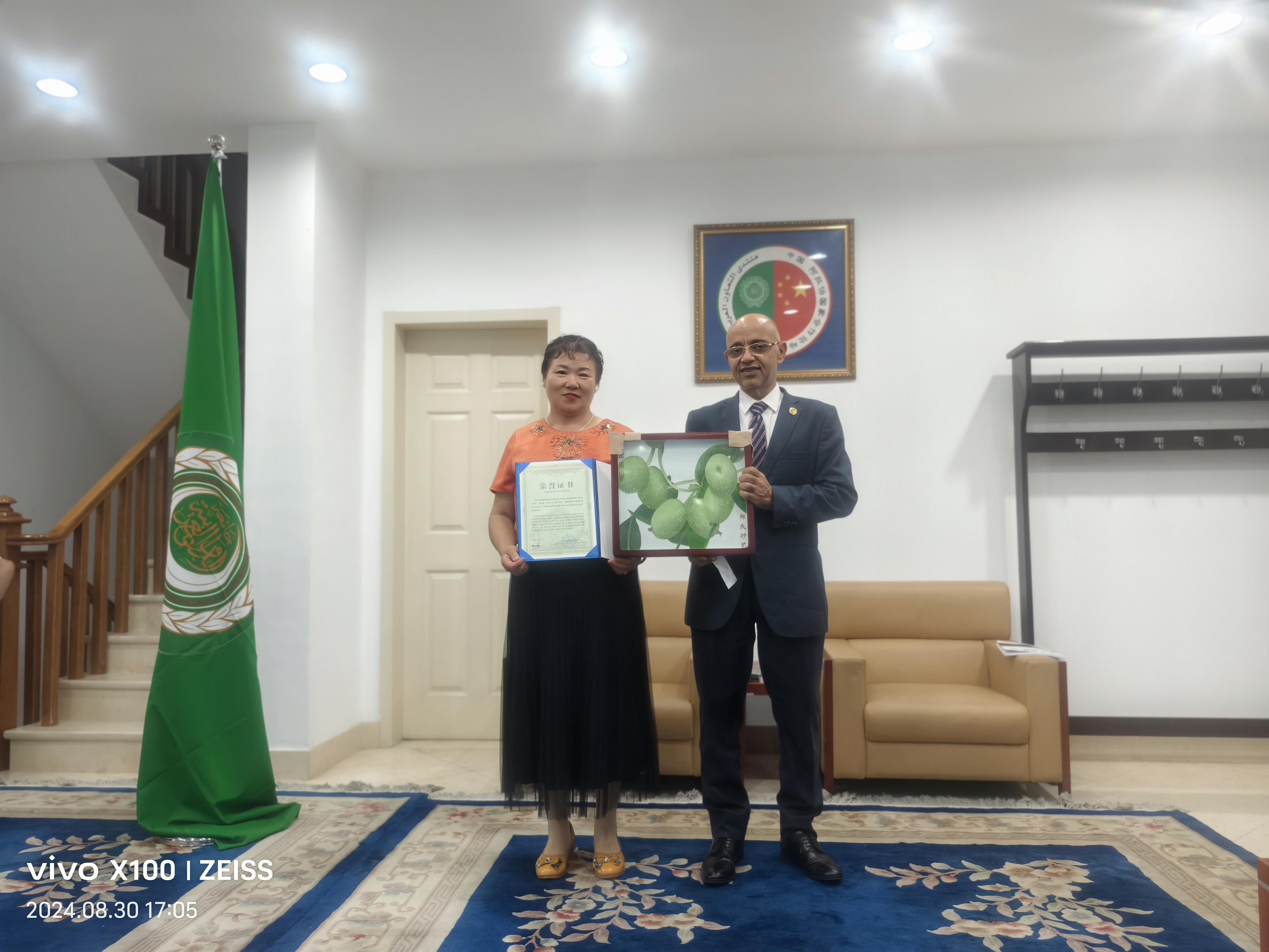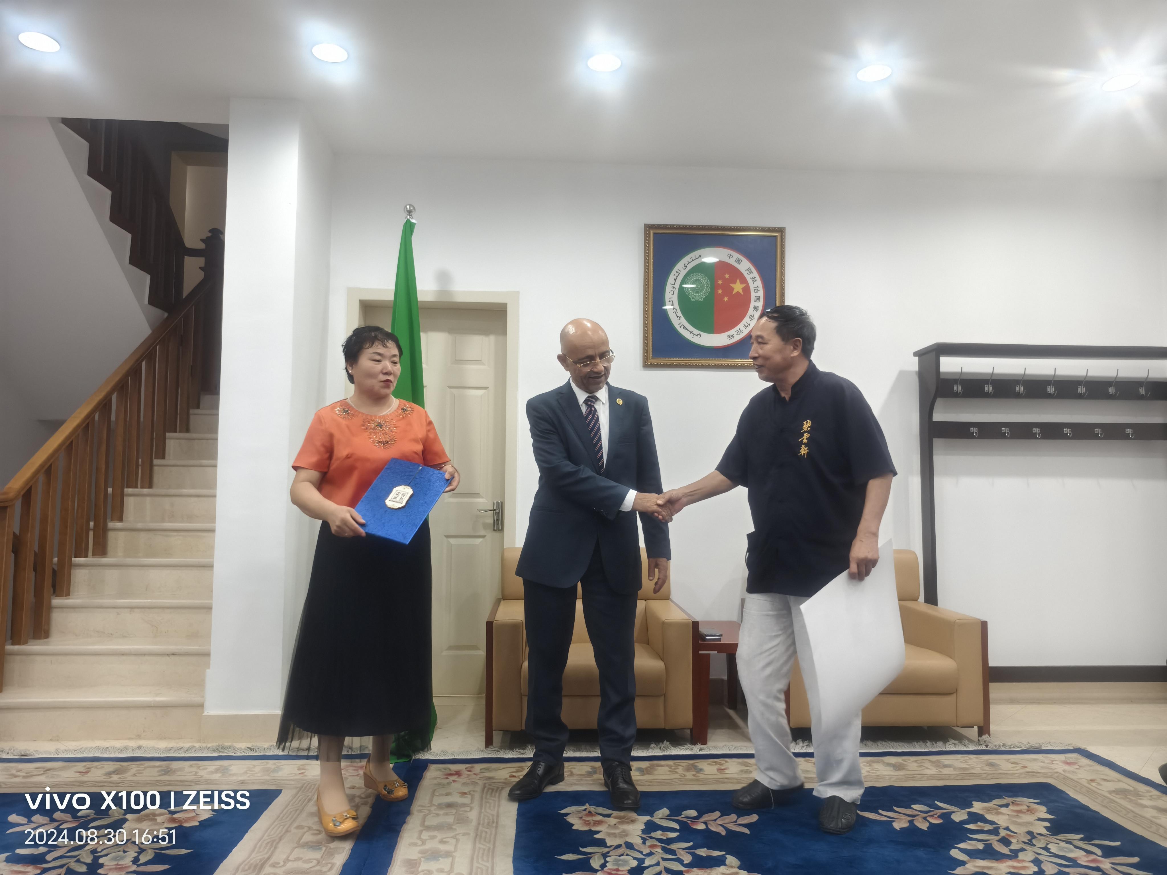2024年8月30日,應阿拉伯駐華大使館邀請,鄭氏砂藝形象代言人劉秀華攜中名聯(lián)簽約國禮藝術(shù)家鄭鐵軍老師的作品到使館進行文化交流,大使館現(xiàn)場將鄭鐵軍老師作品《團團圓圓》作為國禮珍藏。同時為鄭鐵軍老師頒發(fā)了中阿文化交流使者榮譽證書。