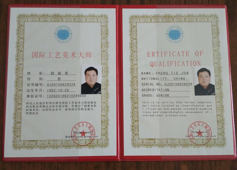 2015年6月,本公司總經(jīng)理鄭鐵軍先生,在規(guī)定時(shí)間內(nèi)修完國際工藝美術(shù)大師組委會(huì)相關(guān)職業(yè)資格認(rèn)證的全部過程,并通過了國際工藝美術(shù)大師組委會(huì)的職業(yè)資格標(biāo)準(zhǔn)考試,達(dá)到專業(yè)水平,具有相應(yīng)的職業(yè)能力,特授“國際工藝美術(shù)大師”稱號(hào)。